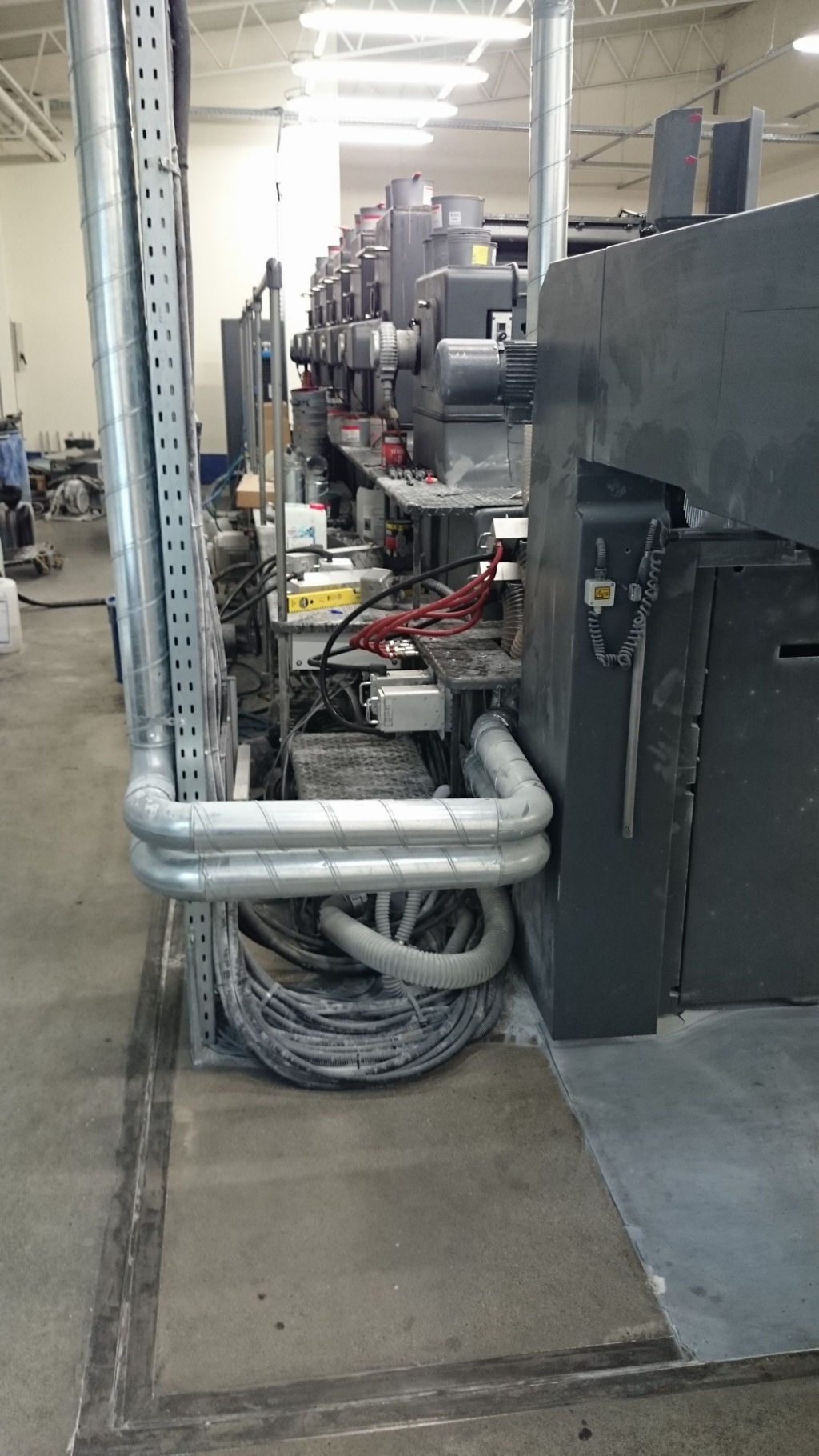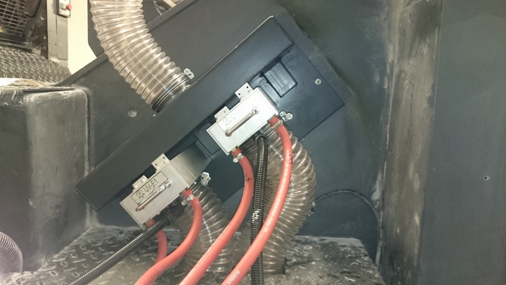 Heidelberg Speedmaster SM72-es típusú 5 szín plusz diszperziós lakkos gépre telepítettünk utólag 2*160W/cm teljesítményű Eltosch UV szárító berendezést, úgy, hogy cserélhető kazettás legyen az infra+meleglevegős és az UV szárító igény esetén.